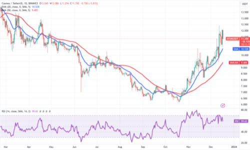 ATOM $11.05几天来一直处于上升趋势。12月,公牛购买了20天EMA(10.52美元)的探底,表明需求量较低。