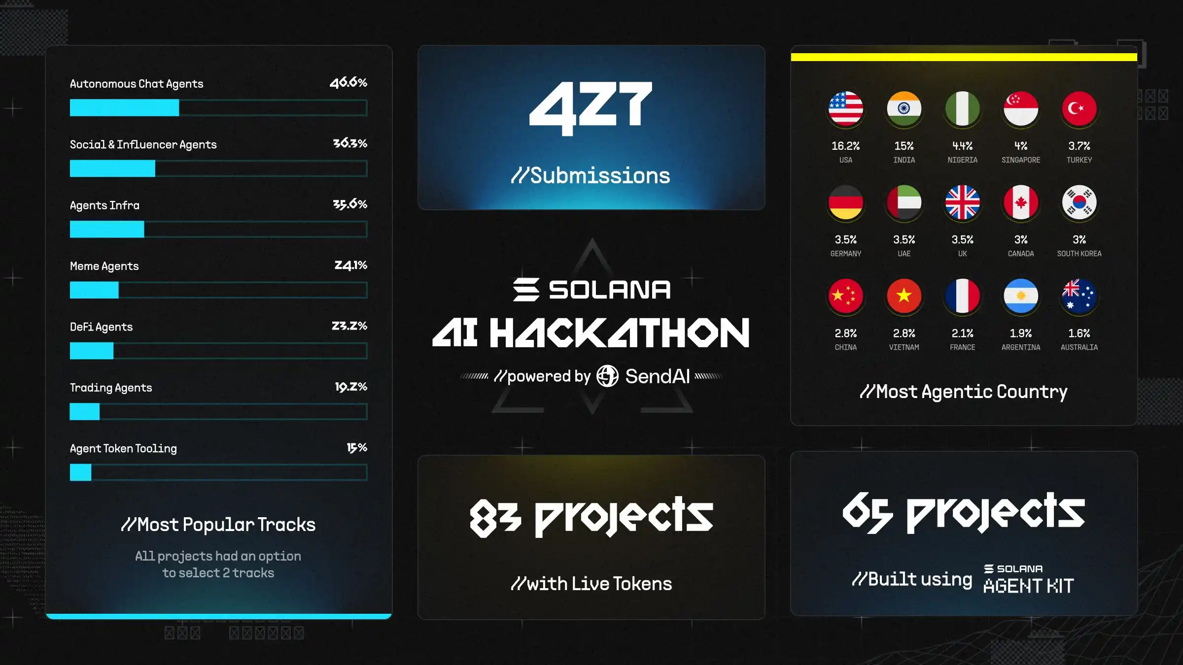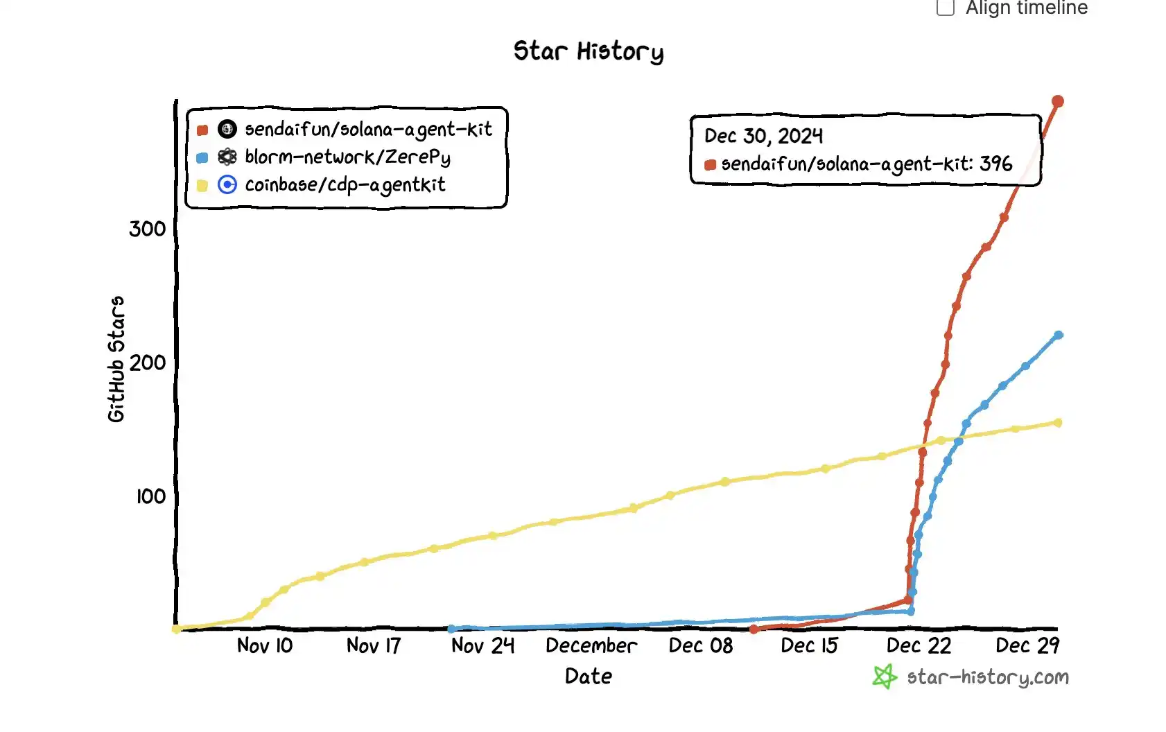 而由 Send AI 主办的黑客松在前几日停止收取名单,**有 427 个项目成功提案。Solana Agent Kit 公布短短几周内,使用 Solana Agent Kit 开发的项目就高达 65 个。而在名单结束后,使用该工具而未参赛的项目更是不计其数,在 2024 年末该开源架构的星星数已经远远超过 Zerepy 和 coinbase 的 cdp agent kit。