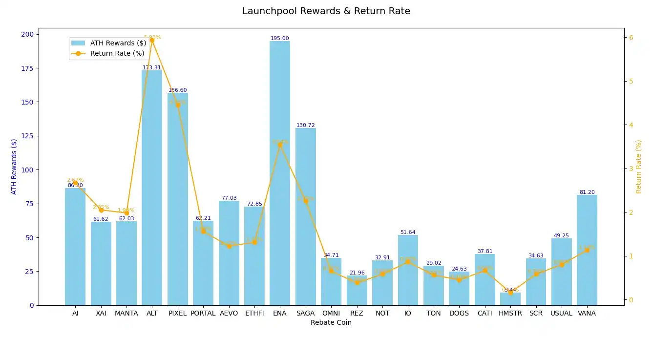 根 PANews 统计,用户如果从年初开始参与这些项目的 Launchpool 活动,平均每次参与活动可获得 1.6% 左右的**金额收益。如果按照获得奖励的****价来看,平均每次参与可获得 70 美元的收入。总计这部分收益**可达到 1481 美元。参与 21 次的总体收益率约为 47.2%。其中,Altlayer 的活动收益**,约为 5.93%,收益金额达到 173.3 美元。PIXEL 的收益次之,收益率约为 4.45%,收益金额约 156 美元