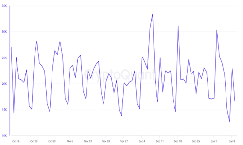 1月8日,当比特币价格突破47,000美元时,流入稳定币交易量达到近33,000笔,高于22,900笔。
