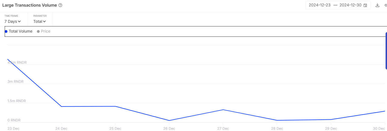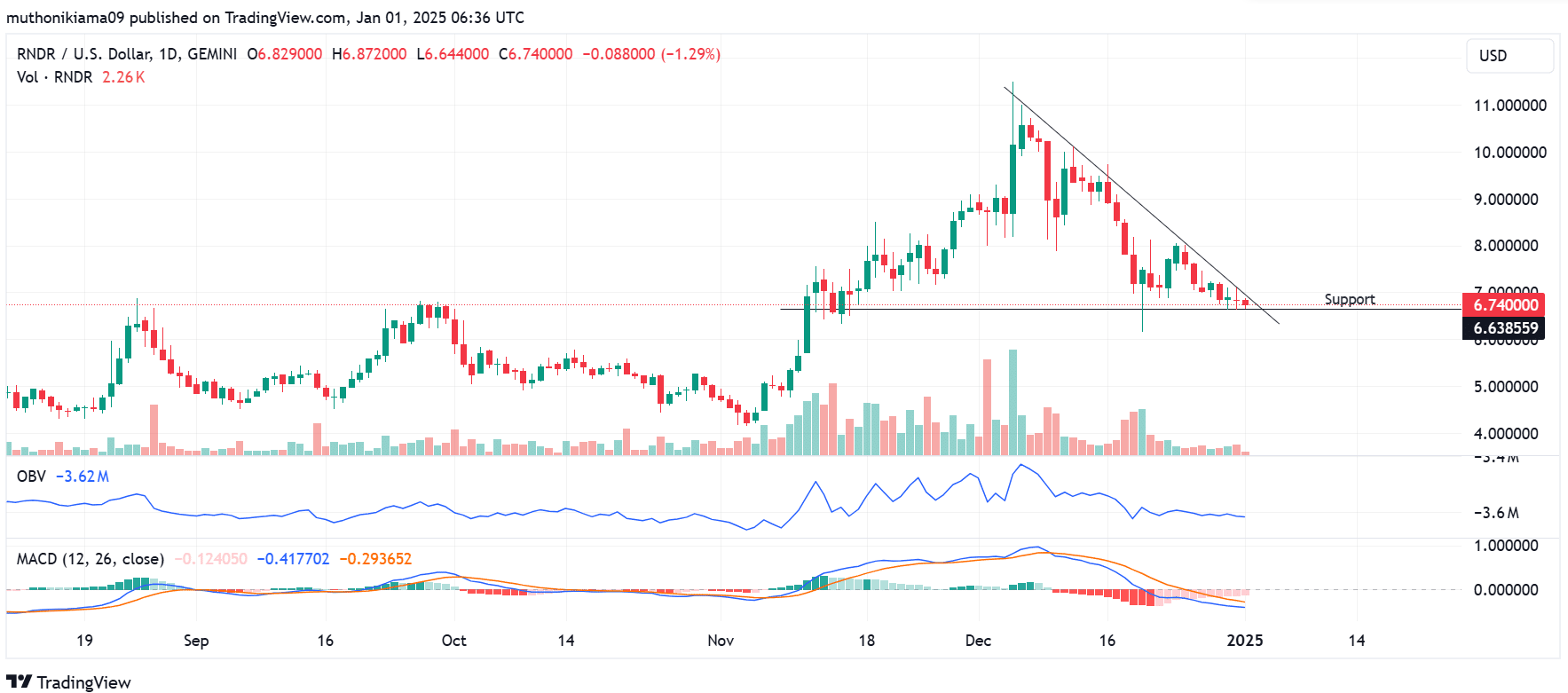 - Render 在其单日图上呈下降三角形模式交易,表明其处于明显的下降趋势。