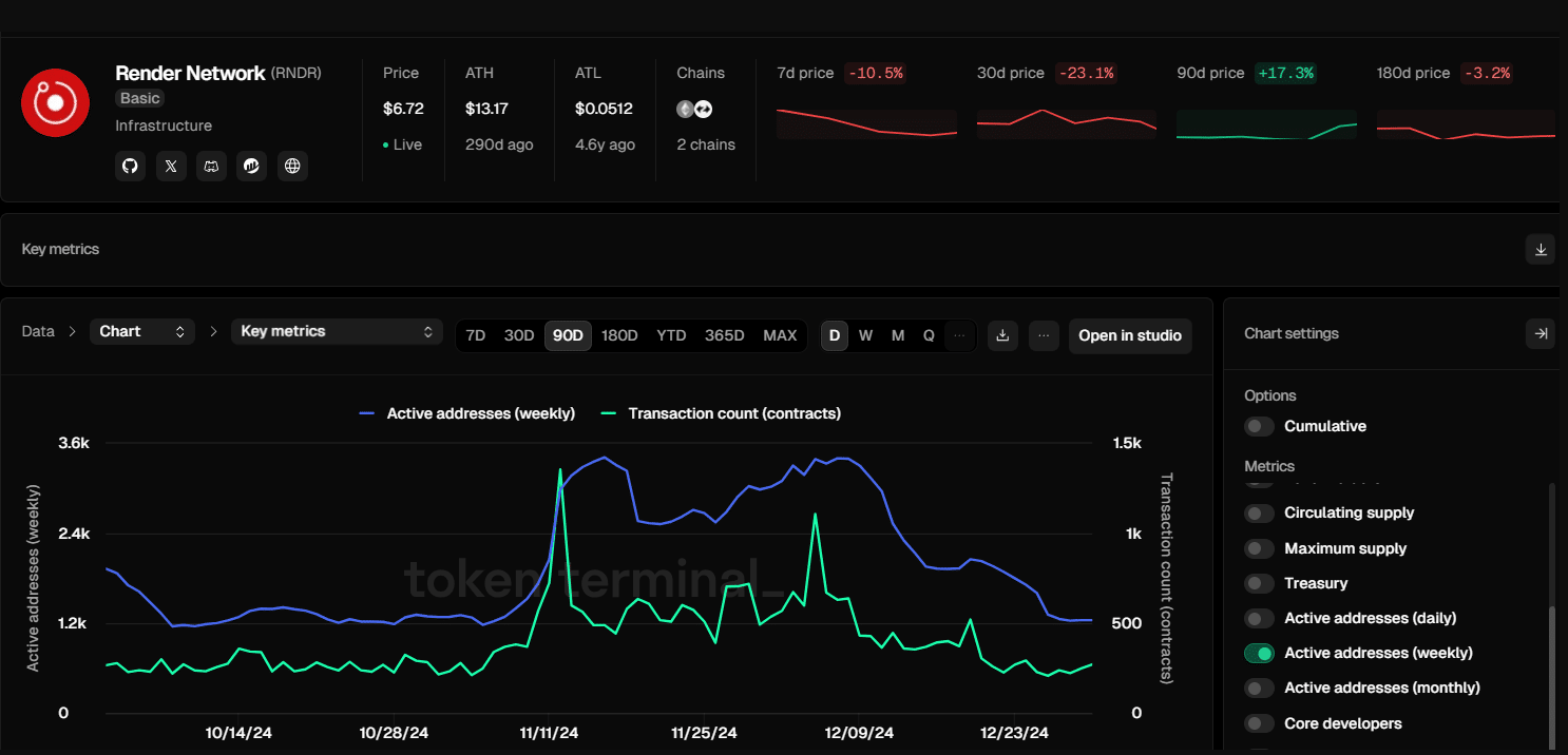 TokenTerminal 的数据显示,Render 网络的活跃度显著下降。在 2024 年 12 月下降 50% 之后,该网络的每周活跃地址数量正接近两个月来的**点。