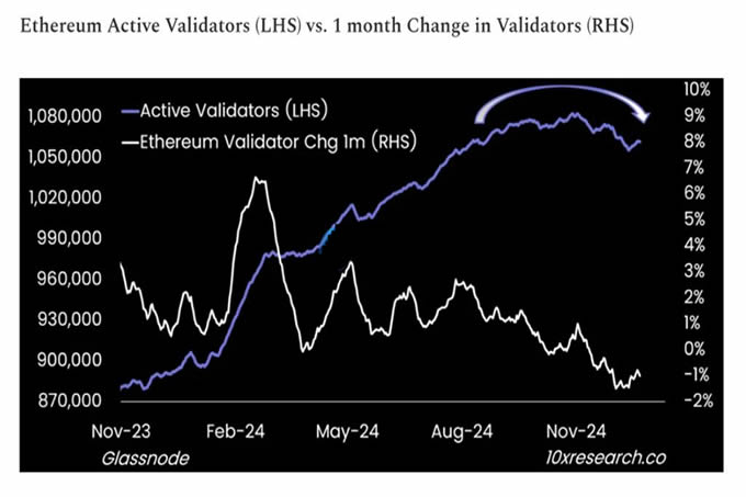 Thielen认为ETH仍然是一项糟糕的中期投资,并预计ETH的表现将在2025年再次落后于BTC。他指出以太坊验证者的成长率已转为负数,在过去30天内下降了约1%,这引发了人们对更多验证者退出网络的风险不断增加的担忧。
