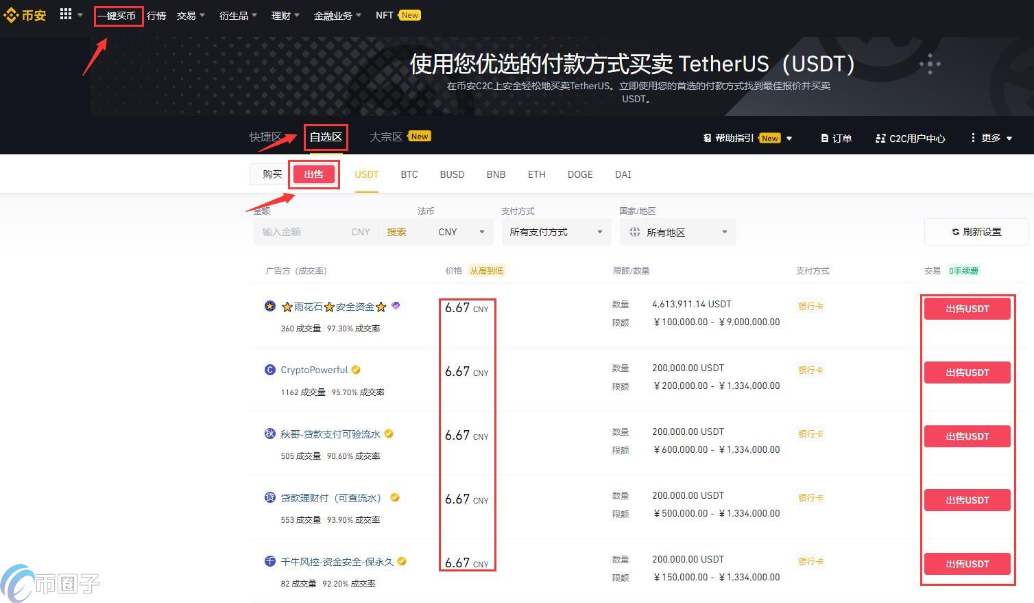3、验证身份后即可进行交易,出售USDT需在首页点击一键买币——自选区——出售选择广告方
