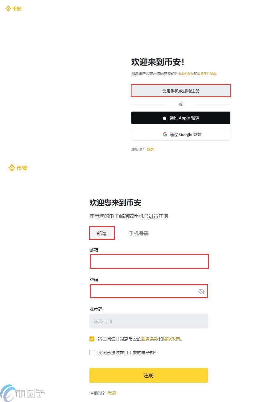 1、打开币安官网,点击【使用手机或邮箱注册】——邮箱(推荐QQ、网易163、搜狐邮箱),填写邮箱、密码即可