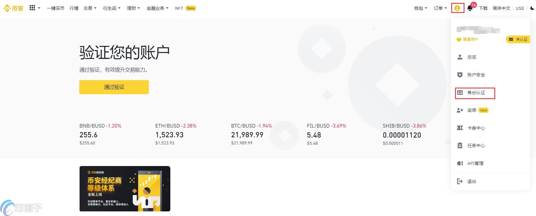 2、注册账号后,在首页点击用户**——身份验证,进行身份验证,在该页面可以查看当前认证级别,它决定了您的账户在币安的交易限额。如需提升额度,请依次完成各个级别的身份认证。