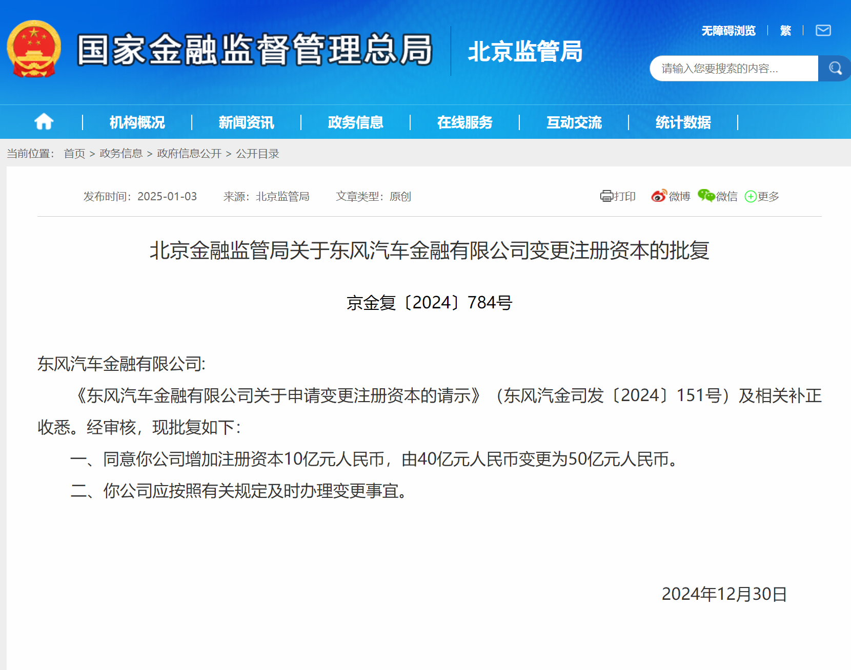 财经1月3日讯 今日,北京金融监管局公布相关批复,同意东风汽车金融有限公司(简称“东风汽金”增加注册资本10亿元人民币,由40亿元人民币变更为50亿元人民币。以下是相关批复正文: