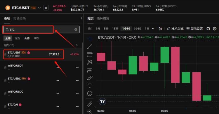 11、在搜索框输入BTC,选择BTC/USDT交易对,可以看到BTC实时行情