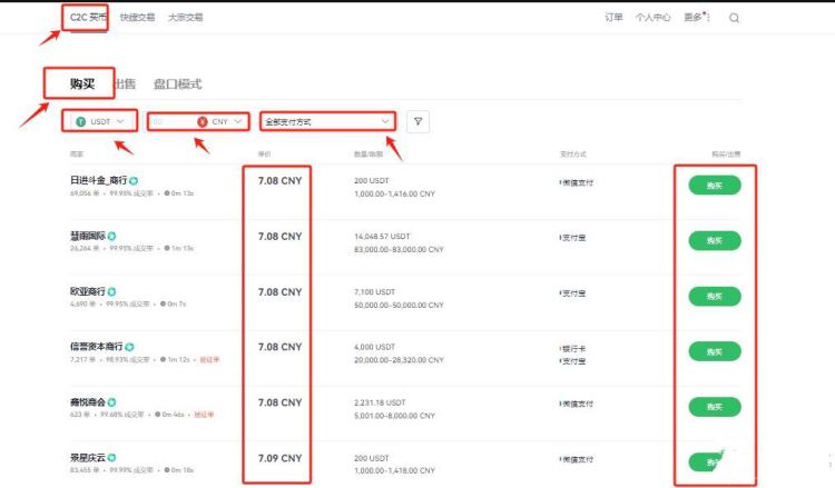 9、进行交易前需要拥有USDT,可在C2C买币进行交易,根据需求选择合适商家,点击“购买”,而后根据提示进行付款、等待商家放币(若是长时间没有收到币种,可联系客服进行处理)