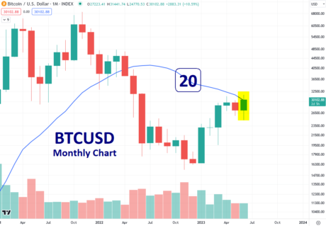 根据比特币/美元历史指数,比特币的 20 个月 SMA 目前位于 29,910 美元,略低于比特币当前略高于 30,000 美元的价格。这使得市值排名**的加密货币自 2022 年 3 月以来**略高于 20 个月移动平均线。潜在意义是什么?如果比特币能够在 6 月份结束时以月度蜡烛图收盘于 20 个月移动平均线上方,这将是比特币历史上第五次发生这种情况,并且是一个通常会导致价格上涨的信号。