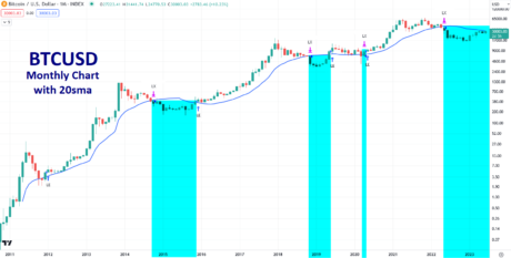 为了更清楚地了解 20 个月 SMA 的重要性,让我们看看所有比特币月度收盘价高于 20 个月 SMA 和低于 20 个月 SMA 的情况。为了做到这一点,我们将创建一个假设的交易系统,严格用于分析目的,当比特币收盘高于其 20 个月 SMA 时“买入”,当比特币收盘回低于 20 个月 SMA 时“卖出”。请注意,“LE”表示买入信号,而“LX”表示卖出信号。蓝色突出显示了系统逻辑在长期退出信号后出售比特币并退出市场的时期。