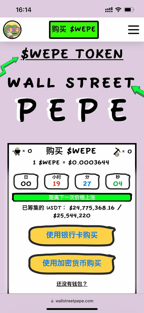 通过Wall Street Pepe的预售,平台目前为早期投资者提供了以折扣价格购买$WEPE的机会。该项目旨在利用Pepe迷因的受欢迎度,同时提供一个高风险、高回报的交易策略平台。