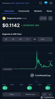 例如,在2021年,Dogecoin的价格从大约$0.009上涨到$0.68,意味着超过7,000%的收益。达到历史**点后,Dogecoin的价格在2021年底下跌至大约$0.17。此后,该下跌趋势持续到2022年和2023年,价格跌至$0.06以下。