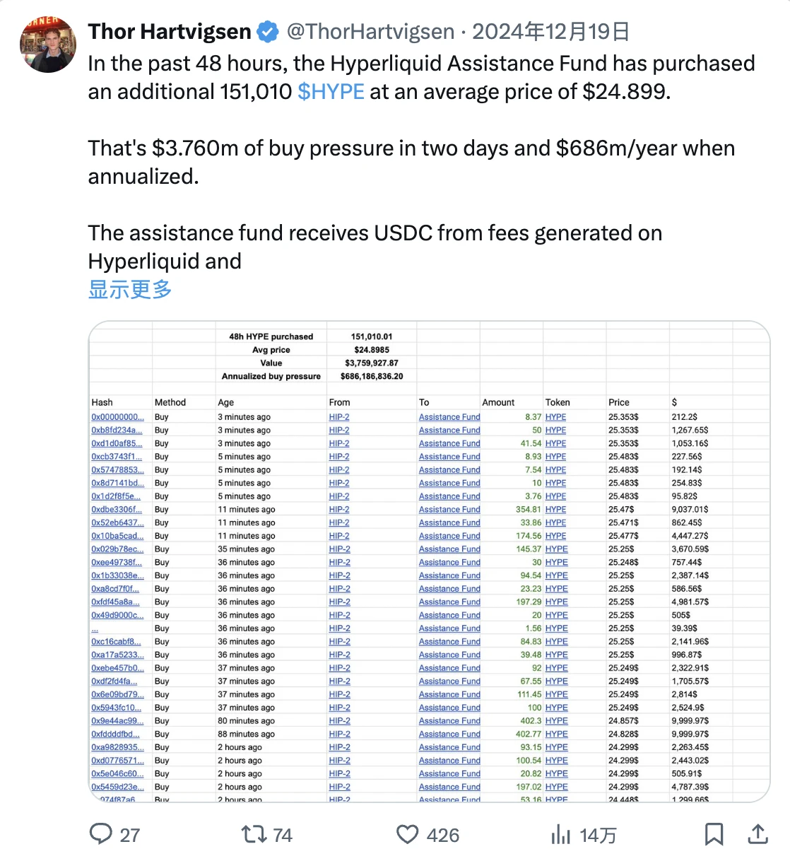 两周前,我在 X 上曾发布了一篇分析文章,分析了 48 小时内援助基金的 HYPE 回购情况。当时, 48 小时内共回购了约 151000 HYPE,这相当于约 6.86 亿美元的年回购力度。