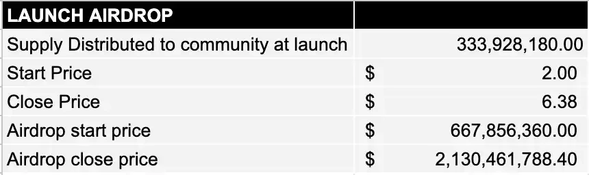 关于激励机制,虽然目前尚未披露具体结构,但很容易推测永续合约和现货交易量可能会受到激励(或已在激励中),毕竟超过 40% 的**供应是为社区奖励预留的。以下是初始空投的具体情况: