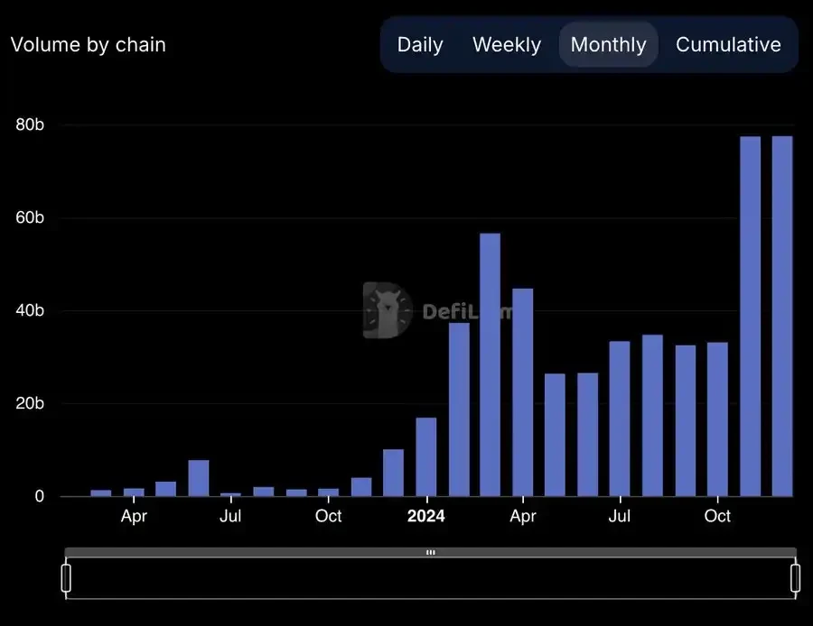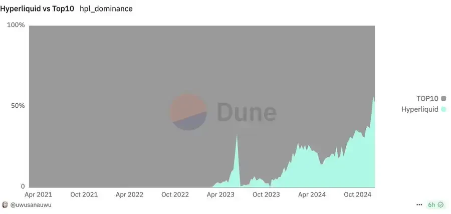 Hyperliquid这一平台不断吸引用户,一方面是由于其去**化的特性,这是当今市场的一大趋势,另一方面则是其与传统**化交易所(CEX,如Binance)日益增长的竞争关系。虽然当前Hyperliquid与Binance的市场份额差距依然明显,但过去数周内,Hyperliquid的市场份额提升显著,展示了其强劲的市场拓展能力。
