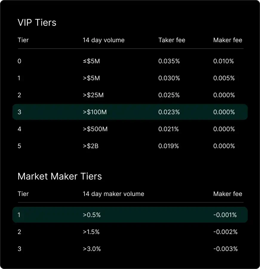 Hyperliquid 之上的手续费由平台上的交易用户支付。与 Binance 等其他交易所相比,Hyperliquid 的费用较低,此举旨在激励更多的交易活动。永续合约交易方面,就大多数用户而言,市价单的费用为 0.035% ,限价单的费用为 0.01% 。交易量越大,费用越低。