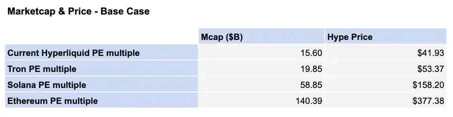 接下来,我们根据收入和市盈率(PE 倍数)计算基础情景和牛市情景下的市场市值。为了得出 HYPE 的价格,我们使用当前的流通供应量,加上 11.6% 的通货**率(用于激励和奖励),这一数据在**部分中已有计算。