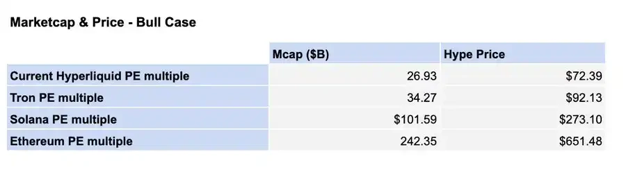 在这些条件下,我们可以看到 HYPE 的价格区间从 41.93 美元(基础情景,**倍数)到 651.48 美元(牛市情景,**倍数)。