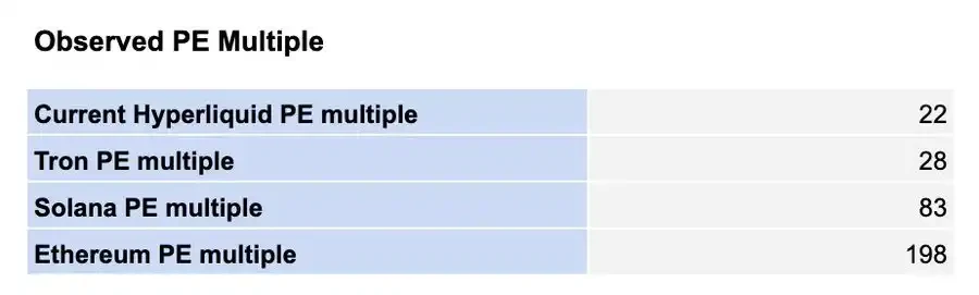 话虽如此,考虑到其他**链(L1)和二级链(L2)的市盈率,当前 Hyperliquid 的市盈率可能偏低。一个「合理」的情景可能是: