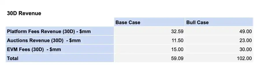 在基础情景下, 30 天的收入为 5900 万美元,而在牛市情景下为 1.02 亿美元。为了得出估值,我们可以使用不同的市盈率(PE 倍数),这些倍数是基于主要**链(L1)的观察数据,并结合年化收入进行计算。