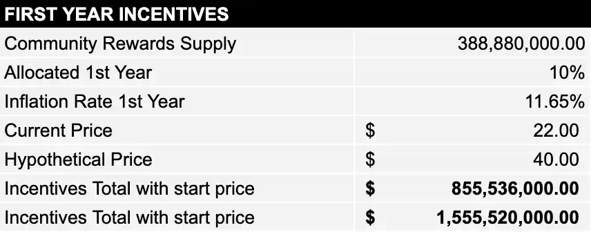 按照当前价格,首年将分发接近 10 亿美元的激励,这远超过空投时 $ 2 开盘价分发的金额。由此产生的激励通胀率约为 11.65% (包括质押奖励,或需额外计算)。