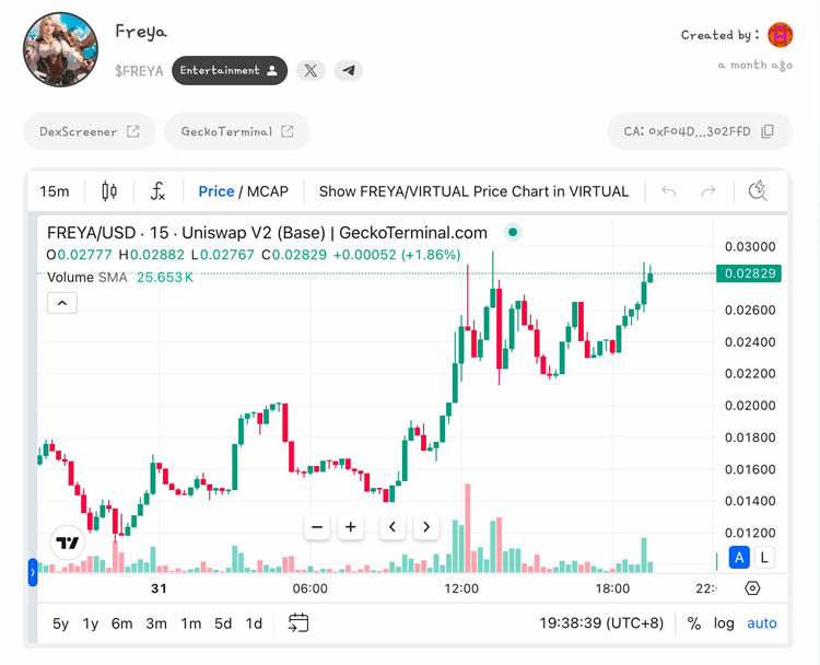 近期市场**门的赛道,当属AI Agent 和所有与代理相关的基础设施。除了市值已经涨到4.7 亿美元的aixbt,其实还有一个同样诞生在Virtuals 上,短短几天内**市值就突破2,000 万大关的AI Agent —— $FREYA。