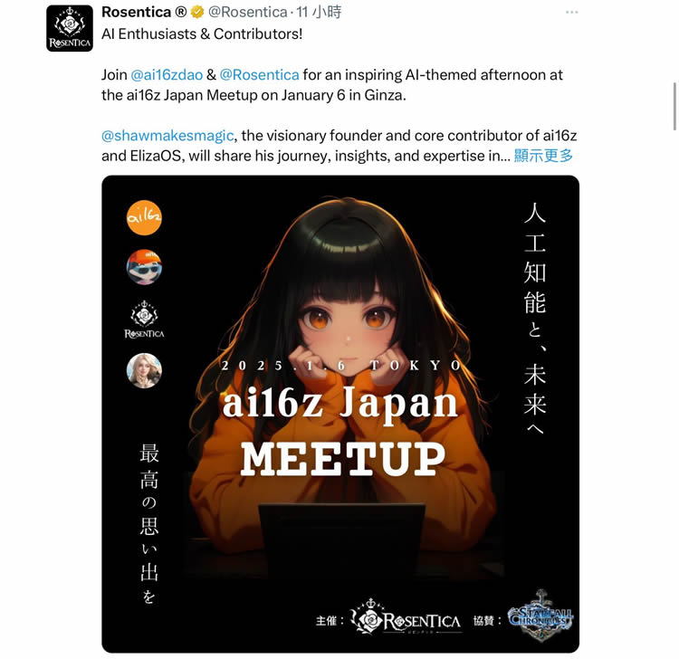 $FREYA 除了有来自aixbt 的大量宣传,官方Rosentica 还背靠Immutable 作为合作伙伴,核心团队近日甚至要与另外一个当红的Agent ai16z 在日本举办AI 主题小聚,可以说是抓住了好几项市场上正热的关键元素!
