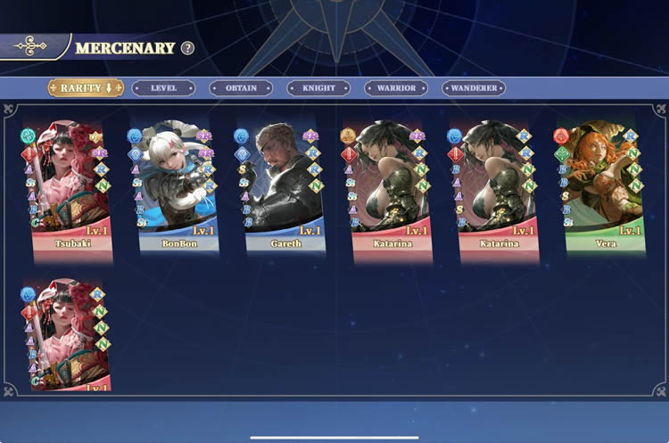 玩家需消耗游戏内的水晶招募佣兵,游戏游戏采用突破性的Fateweaver Gacha 系统,玩家招募的每个角色都具有随机的技能和统计数据,并且确保没有两个玩家的佣兵设定是相同的。每位佣兵都拥有以下特点: