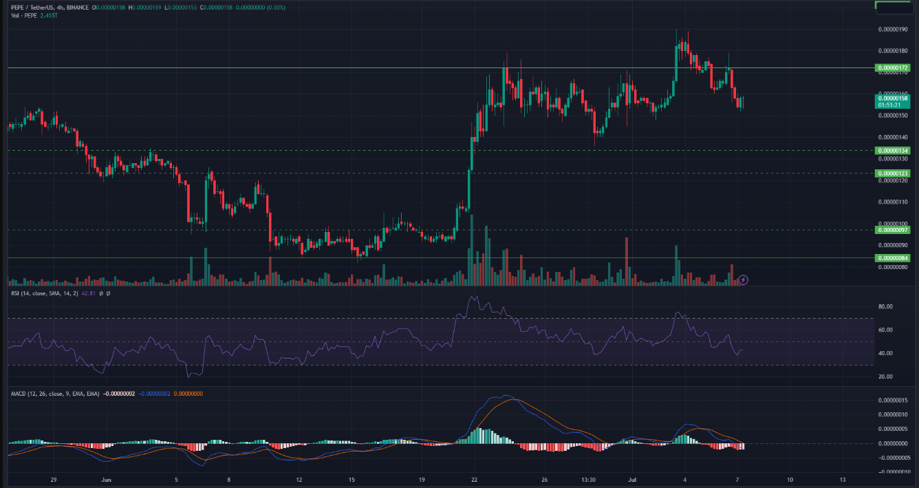 0.00000172 美元的关键阻力位日益凸显,这对曾经推动 PEPE 上涨的看涨力量构成了难以克服的挑战。