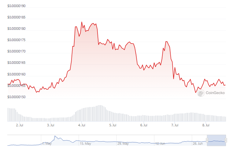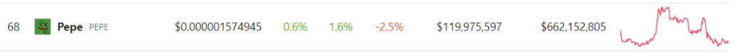 PEPE 在 CoinGecko 上的价格目前为 0.00000157 美元。在过去 7 天里,PEPE 经历了 2.5% 的小幅下跌。最近的这些数据引起了投资者和分析师的担忧,因为 PEPE 的看涨势头似乎正在减弱。