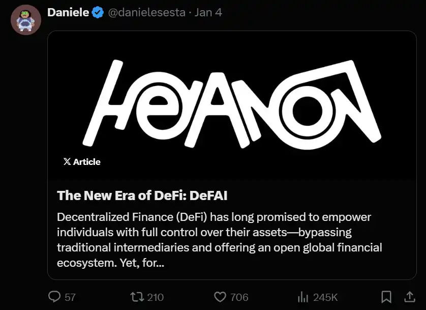 另外,danielesesta 通过 HeyAnonai 的 DeFAI 理论引起了广泛关注。他宣布 HeyAnon 正在开发以下内容: