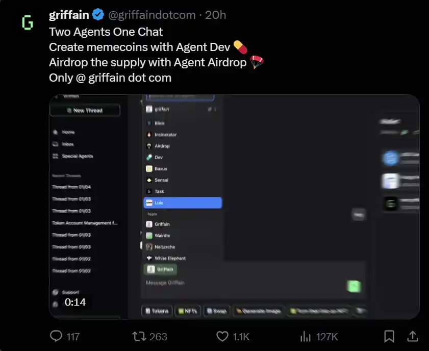 Griffain 更加通用,允许用户执行从简单到复杂的各种操作,如任务自动化(DCA)、发布 memecoin 和进行空投等。