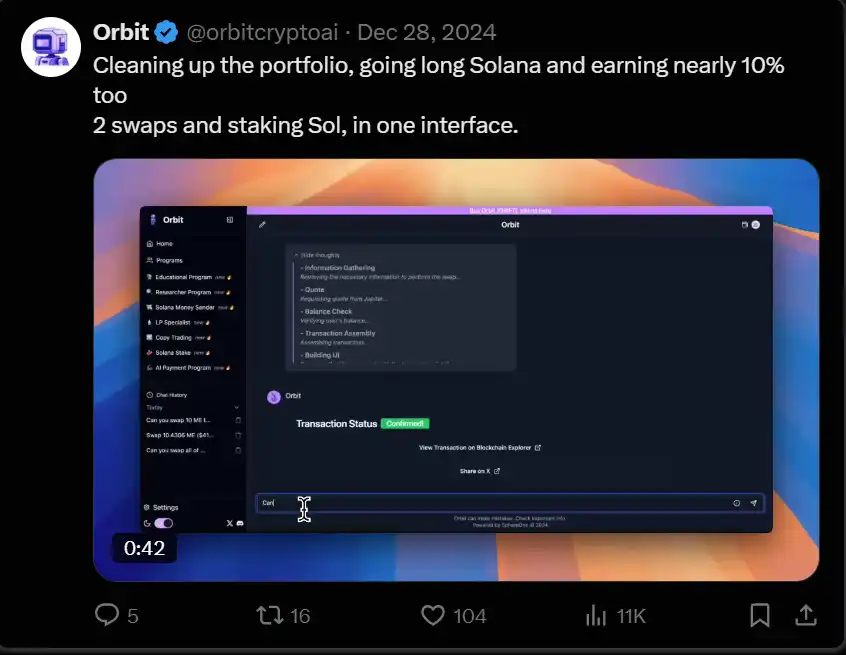 Neur 是第三个推出**的项目,但由于其开源的特点,迅速在估值上超越了 Orbit。Neur 将自己定位为 Solana 的副驾驶,专为 Solana 生态系统设计。Neur 由 sendaifun 的 Solana Agent Kit 提供支持。