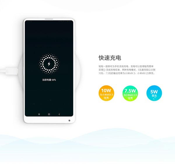 无线充电器接上电源,把手机轻轻一放上去即可充电。小米mix3采用Qi无线充电标准,支持两种充电模式5瓦普充和分别10瓦、7.5瓦的输出功率为小米mix3快充。