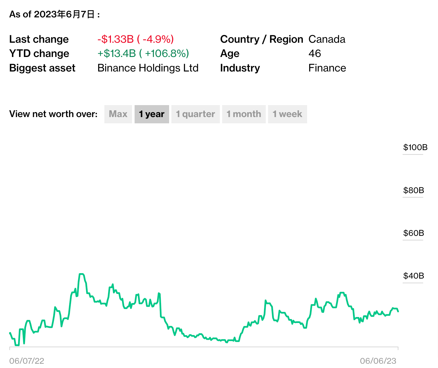 彭博亿万富翁指数显示,币安CEO赵长鹏(CZ)净资产在2022年1月达到969亿美元的峰值后,在去年6月身家蒸发856亿美元,坠入约100亿美元的低谷。