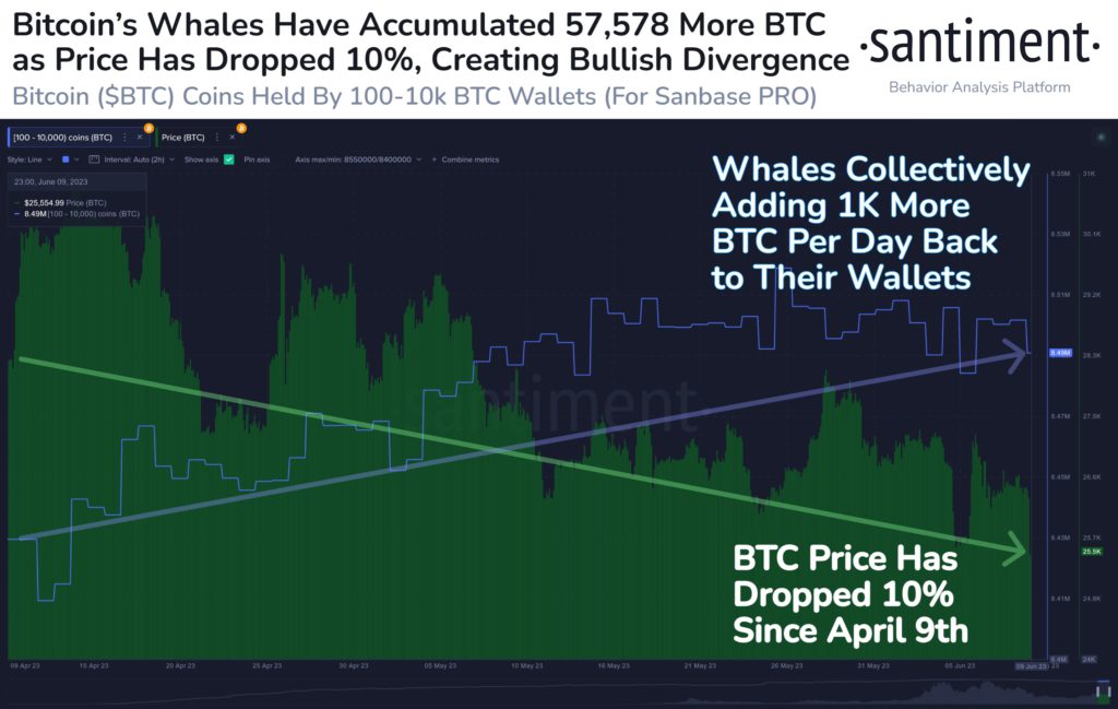 另外据链上分析平台Santiment**报导,也显示出比特币巨鲸们(持有100~10,000BTC)从四月份(**3.1万美元)比特币价格下跌10%的趋势中,反而额外增持了57,578BTC,平均每天增加约1,000BTC。