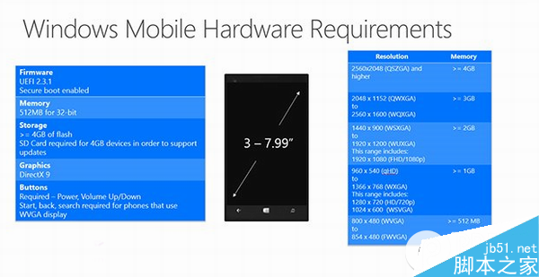 Windows10手机屏幕尺寸支持3-7.99英寸,**内存512MB,内置存储要大于或等于4GB,4GB内置存储必须要有SD卡扩展。**分辨率800 X 480。