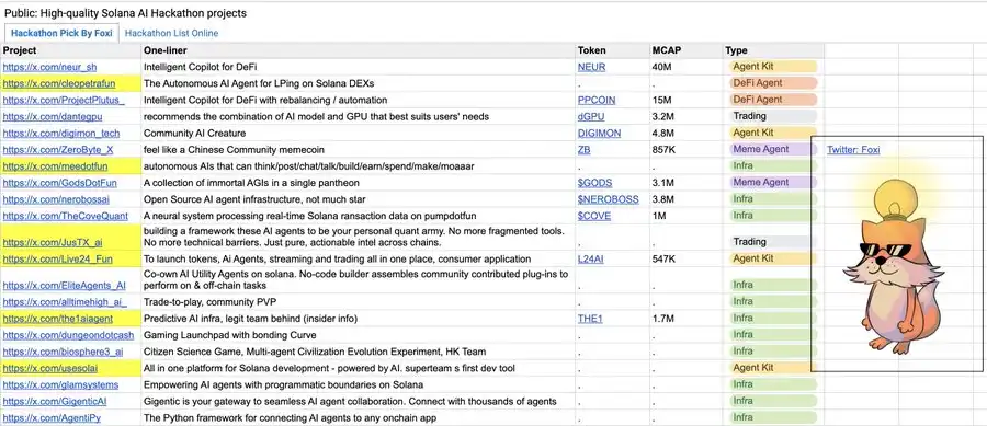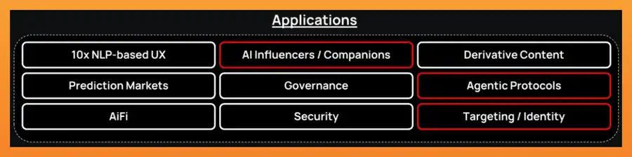 正如上面提到的,我看好即将到来的 DEFAI(DeFi 与 AI 的结合)叙事。这符合我对阶段 2(agent 对人类)的假设。一个很好的起点是通过以下的 DeFi x AI 项目及其细分领域进行学习: