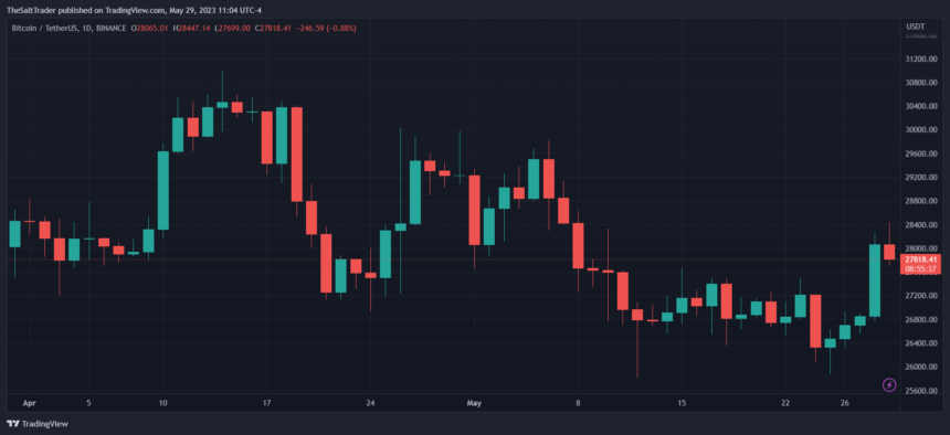 在过去两周亏损交易后,比特币终于看到了一些绿色。加密货币继续在窄幅区间内交易,但期权市场的活动可能暗示可能会创出新高。目前比特币 (BTC) 在过去 24 小时内的交易价格为 27,900 美元,利润为 2.5%。上周,该加密货币的利润翻了一番,达到 4.4%。市值前 10 名中的其他加密货币也在经历类似的势头。