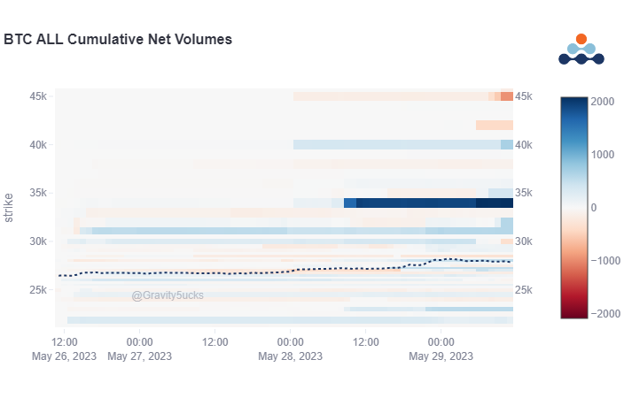 低于 7 天的 ATM-28k 看涨期权 7 月 31k 看涨期权在长周末之前勇敢地买入 Theta 随着债务上限谈判的进展和 7 月 8 月 34k 看涨期权的大型 DSOB 买家在 27.3k 现货切片之前以更高的价格积极积累现在28k。