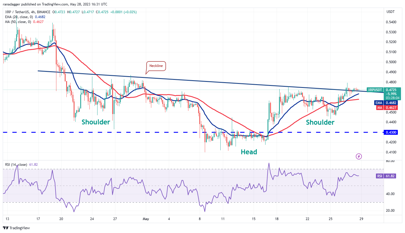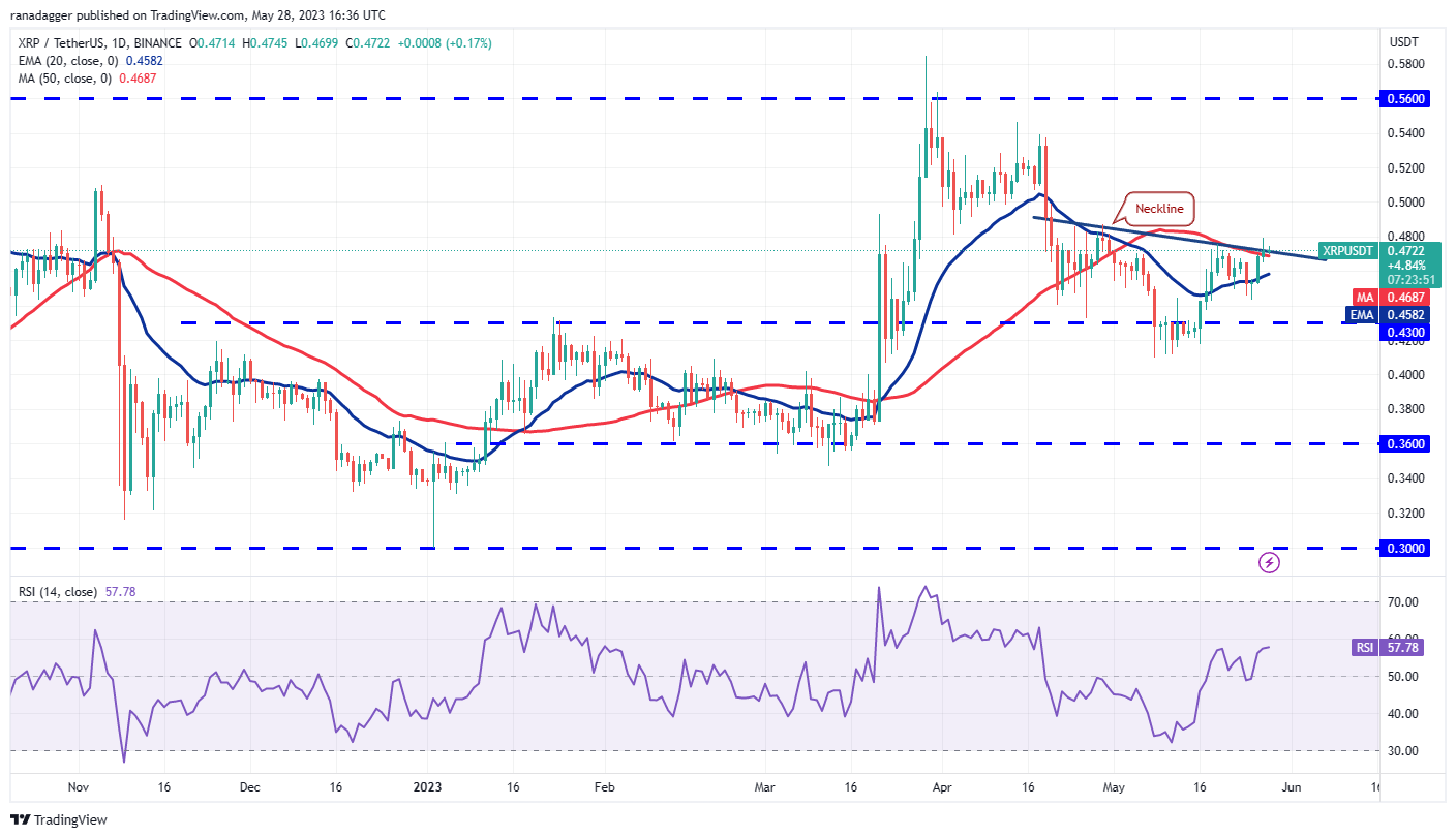 20 日均线(0.45 美元)逐渐向上倾斜,RSI 已跃升至正值区域,表明阻力**的路径是上行。如果多头推动并将价格维持在颈线上方,则 XRP/USDT 货币对可能会开始反弹至 0.54 美元至 0.58 美元之间的上方阻力区。看涨设置的形态目标是 0.55 美元。
