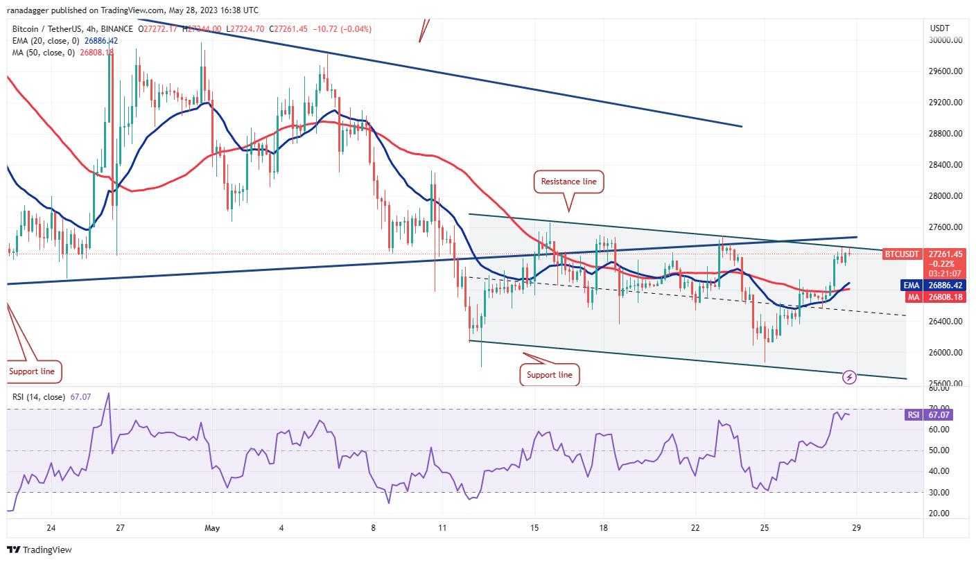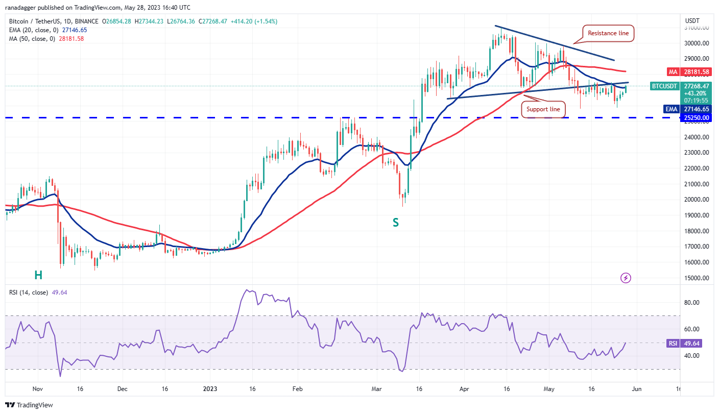 比特币已达到 20 天指数移动平均线(27,146 美元)和对称三角形支撑线之间的上方阻力区。该区域可能会见证多头和空头之间的激烈争斗。
