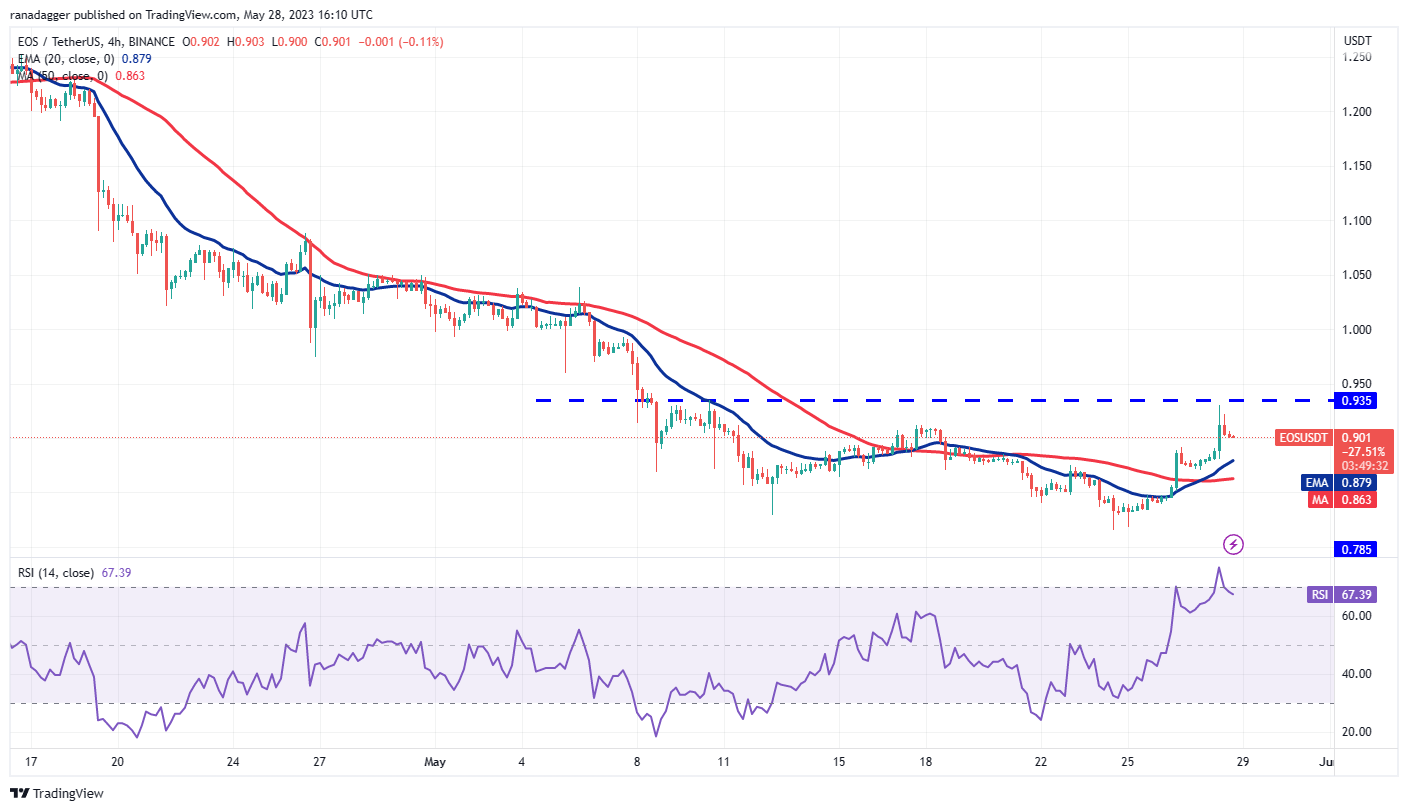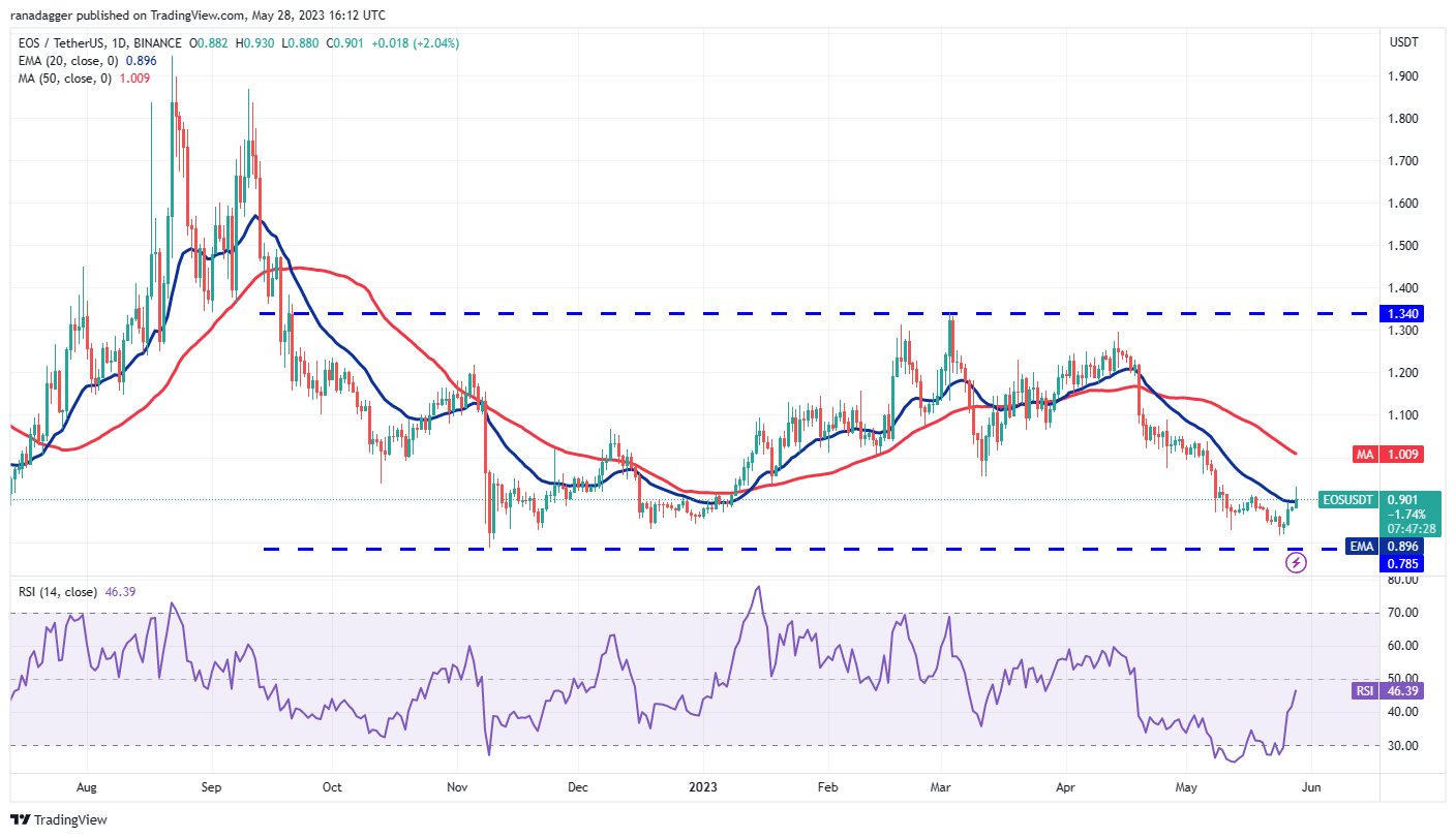 EOS/USDT 货币对在 5 月 25 日从 0.81 美元反弹,并在 5 月 28 日升至 20 日均线(0.89 美元)上方。这是该区间保持不变的**个迹象。多头将试图将价格推高至 50 日均线(1 美元),空头可能会在该处进行强力防御。