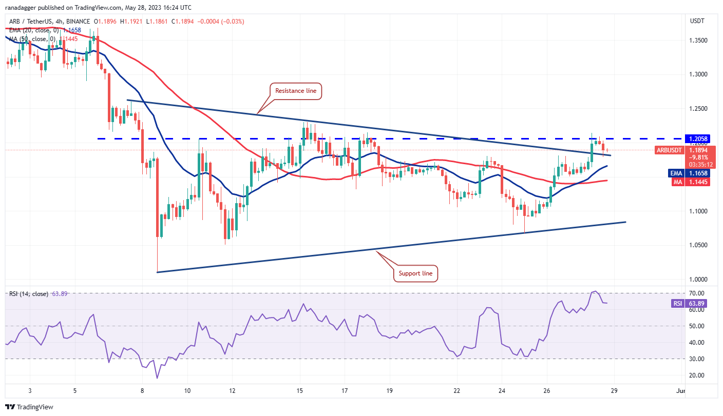 5 月 28 日,多头将 Arbitrum (ARB) 推回 20 日均线(1.17 美元)上方,表明潜在复苏的开始。