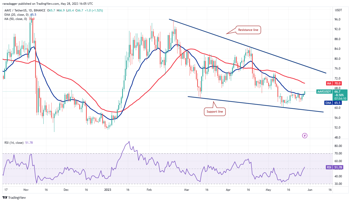 **VE/USDT 货币对可能首先升至 50 日均线(70 美元),然后尝试反弹至阻力线。突破并收于该水平上方可能会开始短期上涨。
