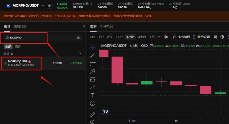 11、在搜索框输入MORPHO,选择MORPHO/USDT交易对,可以看到MORPHO实时行情