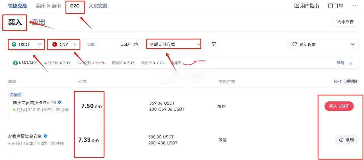 4、认证结束后,点击首页页面上方导航栏的“买币”——“法币交易”,购买货币之前通常需要购买**数量的USDT,以便交易。选择C2C,选择买币,选择USD,根据自己的需求选择合适的商家。