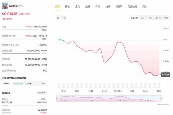 hippo币是一种源自网红河马形象的模因**,属于Sui生态的一部分,并非国产币。它是社群驱动的迷因币,强调社群参与和慈善倡议,特别是**动物保护方面的项目。hippo币在SUI区块链上运行,提供较快的交易速度和较低的费用,并已在多个交易所上线。作为一种数字货币,hippo币不仅丰富了数字货币市场的多样性,还为粉丝和投资者提供了新的参与和表达方式。
