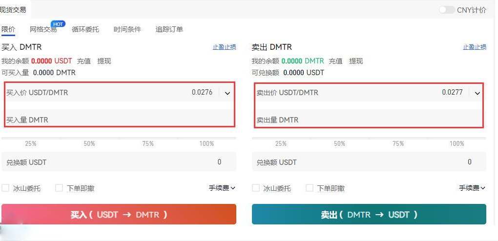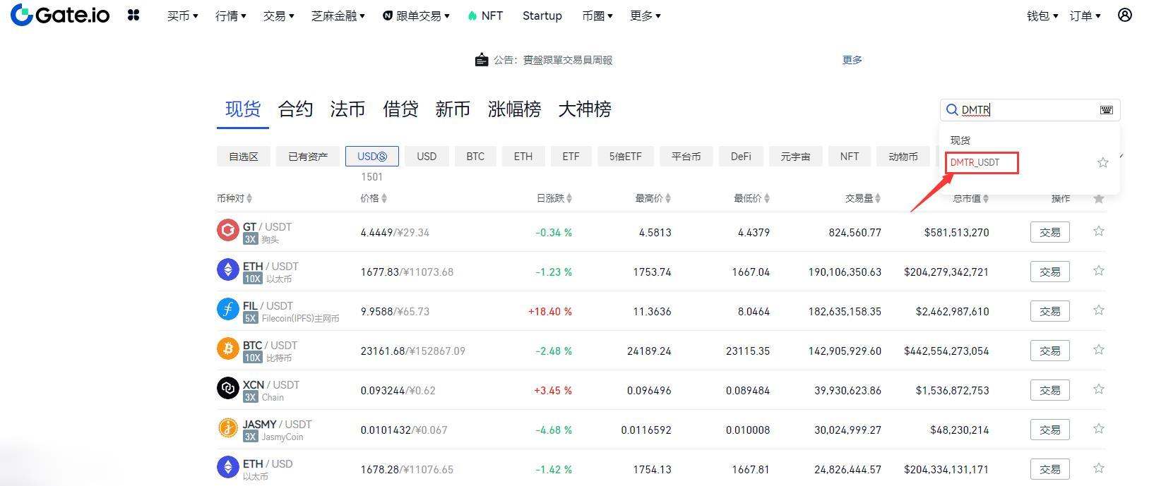 第三步:点击交易DMTR/USDT交易对,进入购买页面